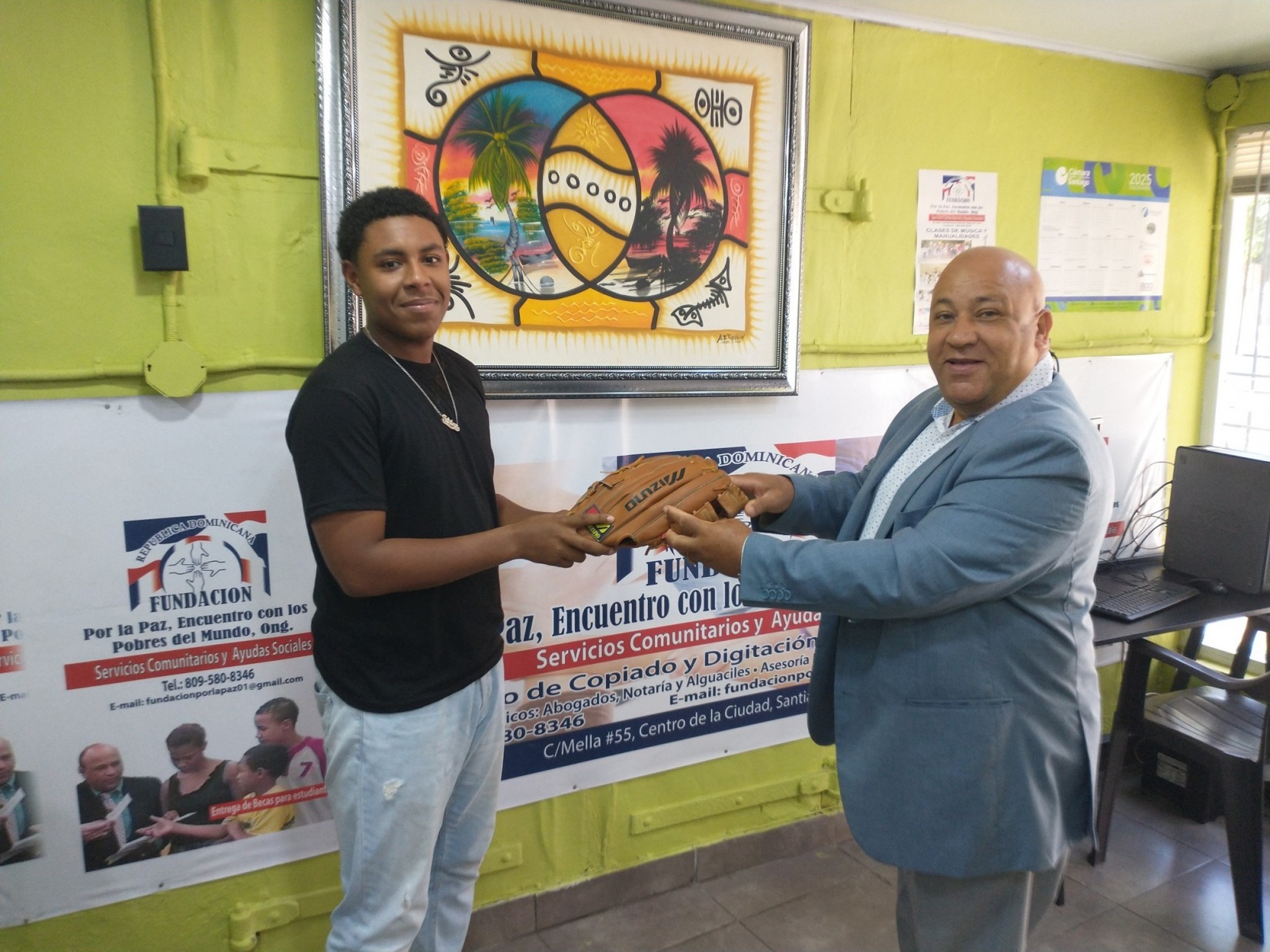 Presidente de fundación por la paz entregando guante de beisbol a jugador de pelota.